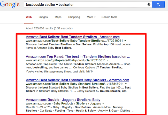 Step 1: Key in your main keyword + bestseller to get the best selling list of the particular product you’re working on from Amazon. For example, if you’re working on double strollers and your main keyword is best double stroller, key in “best double stroller + bestseller”. You’ll see the Amazon bestseller link as the top results.
